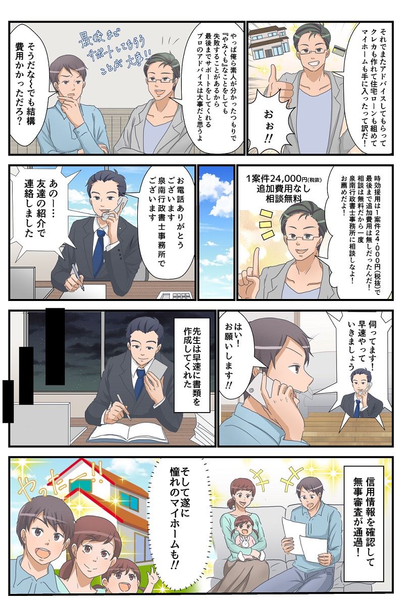 時効援用専門の泉南行政書士事務所では、初めに無料相談でお客様一人ひとりに合わせた最善の解決方法をご提案いたします。5年以上払っていない借金で、時効で解決をご希望の場合、1件26,400円(税込)で解決いたします。借金の時効援用後に住宅ローンをお考えでしたら、泉南行政書士事務所にご相談を